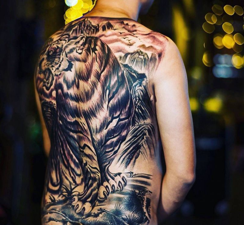 当前位置: 首页 >湖北省武汉市纹身店-武汉老兵纹身店纹身图案>霸气的满背老虎纹身图片_成品背部传统动物纹身图案