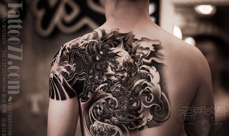 当前位置: 首页 >湖北省武汉市纹身店-武汉老兵纹身店纹身图案>反半胛唐狮纹身纹身图片