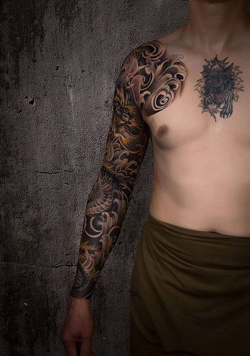当前位置: 首页 >湖北省武汉市纹身店-武汉老兵纹身店纹身图案>传统花臂龙纹身作品纹身图片
