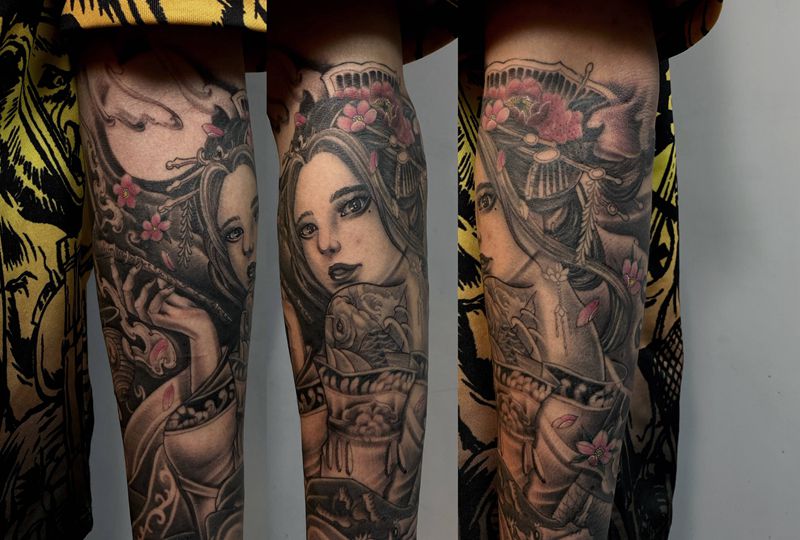 包小臂纹身图片_手臂手部新传统艺妓鱼包小臂纹身图案