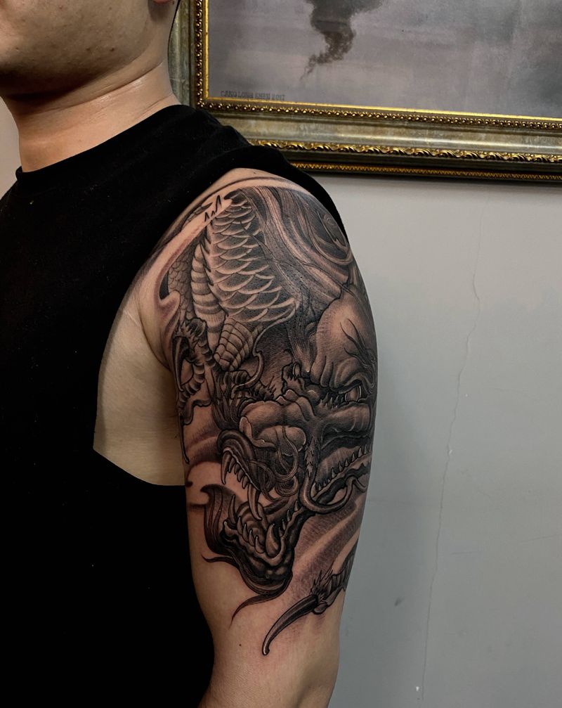 当前位置: 首页 >湖北省武汉市纹身店-武汉危笑刺青纹身图案>传统黑灰龙纹身图片_手臂手部新传统欧美写实龙纹身图案