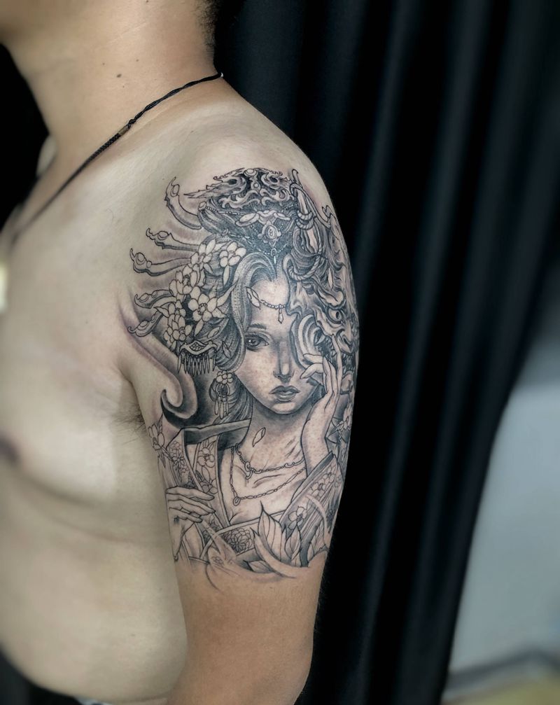 当前位置: 首页 >湖北省武汉市纹身店-武汉危笑刺青纹身图案>艺妓纹身图片_手臂肩部新传统般若艺妓纹身图案