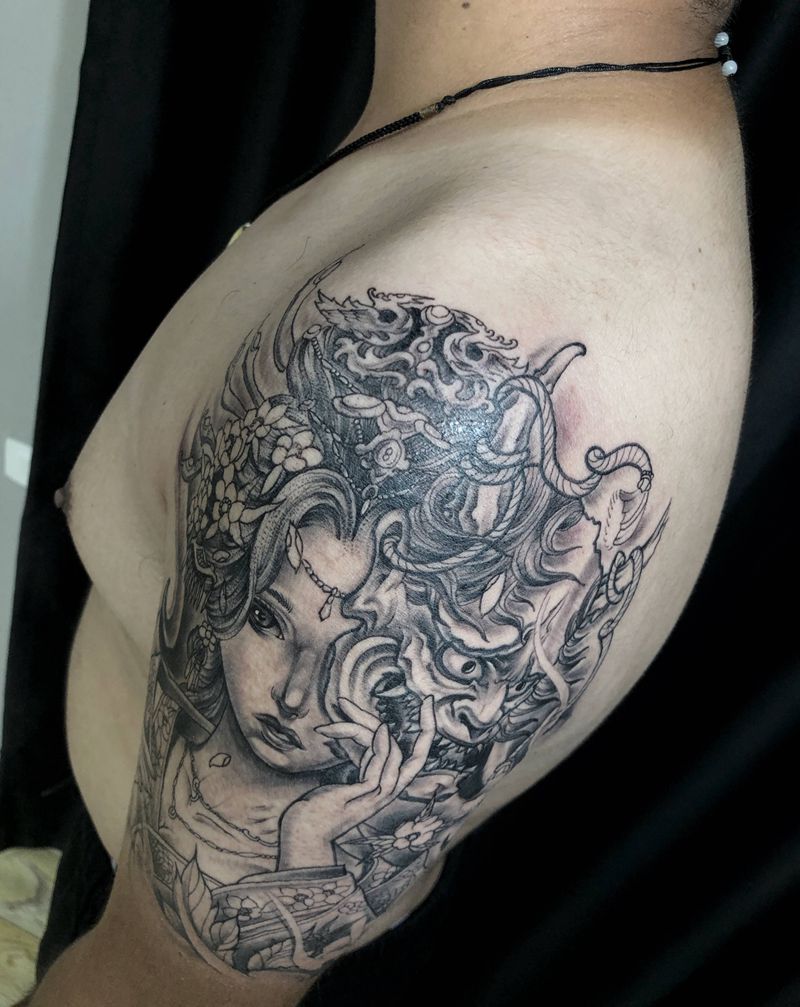 当前位置: 首页 >湖北省武汉市纹身店-武汉危笑刺青纹身图案>艺妓纹身图片_手臂肩部新传统般若艺妓纹身图案