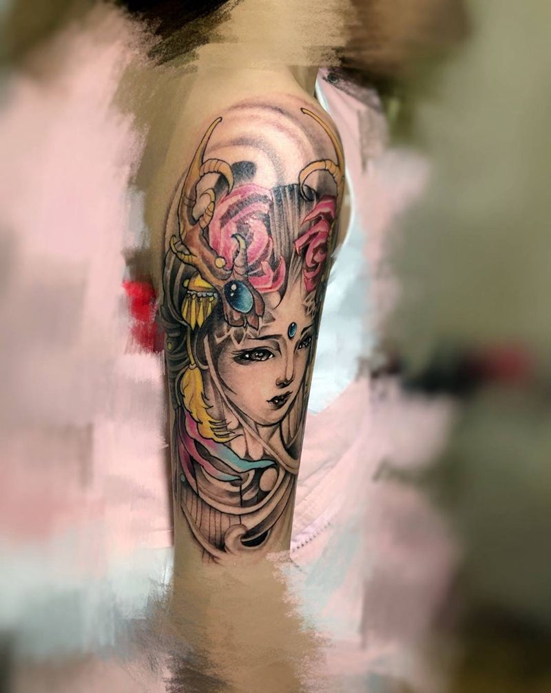 当前位置: 首页 >湖北省武汉市纹身店-武汉危笑刺青纹身图案>艺妓纹身图片_手臂手部新传统New School艺妓般若纹身图案