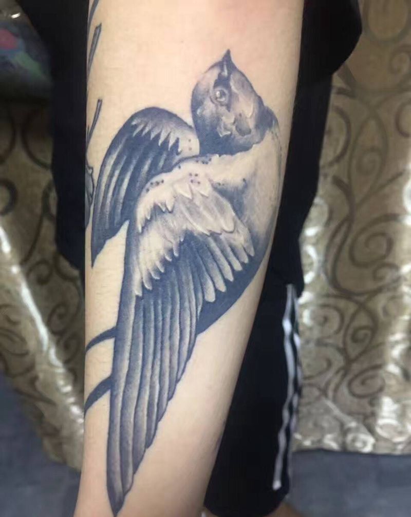 当前位置: 首页 >湖北省武汉市纹身店-匠心刺青纹身图案>写实鸟和花纹身图片_手臂植物写实纹身图案