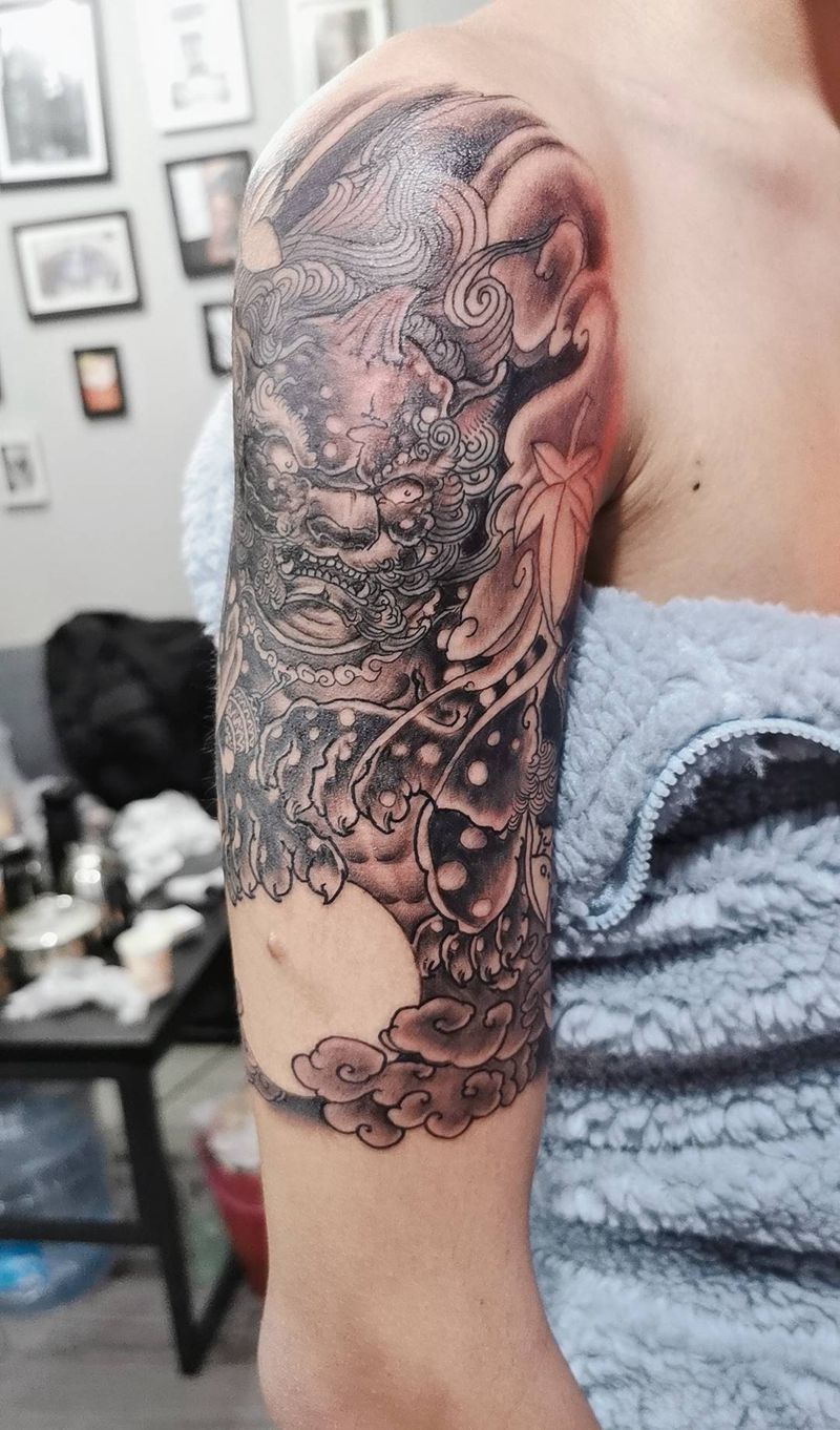 当前位置: 首页 >湖北省武汉市纹身店-释魂刺青纹身图案>唐狮纹身图片_手臂新传统纹身图案