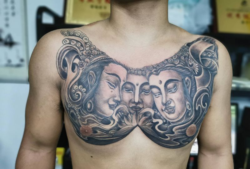 三面佛花胸纹身纹身图片_胸部手臂新传统欧美写实纹身图案