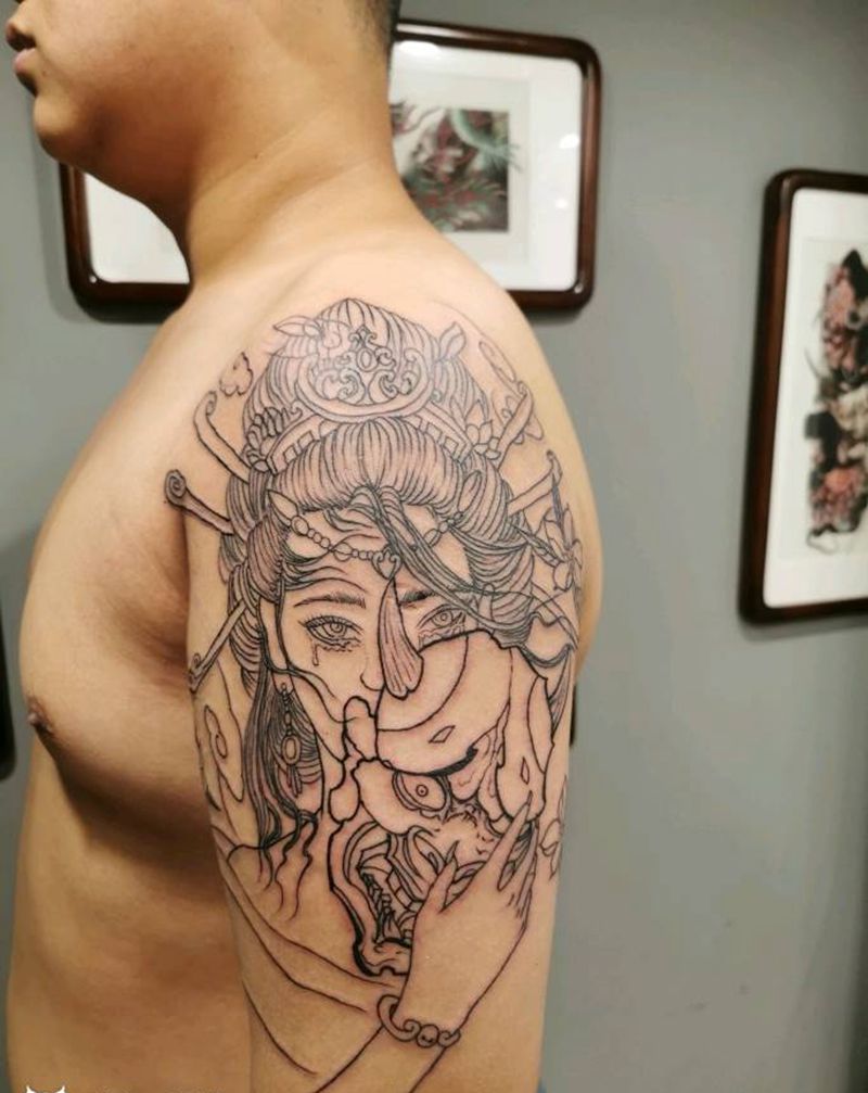 当前位置: 首页 >湖北省武汉市纹身店-释魂刺青纹身图案>艺伎线条纹身图片_手臂新传统纹身图案