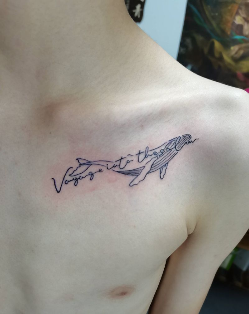 鲸鱼英文纹身图片_胸部花体字纹身图案