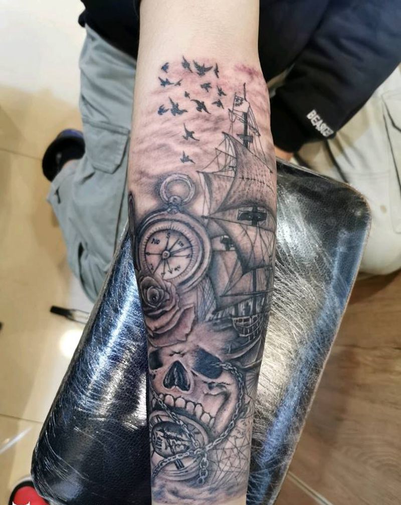 欧美写实帆船骷髅指南针怀表纹身纹身图片_手臂欧美写实几何纹身图案