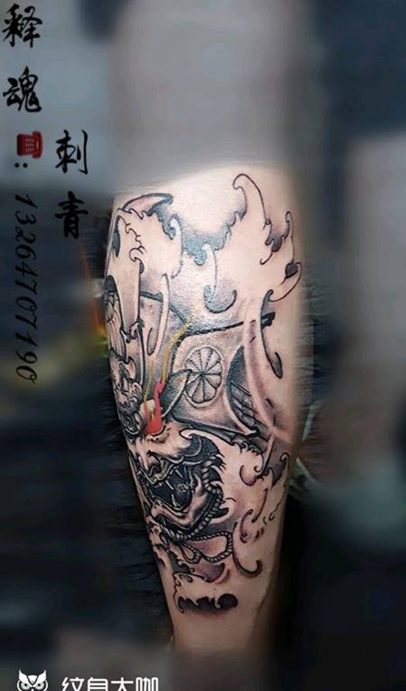当前位置: 首页 >湖北省武汉市纹身店-释魂刺青纹身图案>鬼武士小腿作品纹身图片