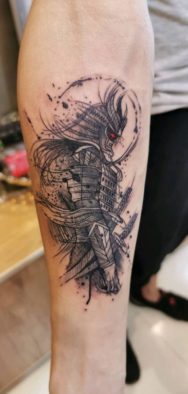 当前位置: 首页 >湖北省武汉市纹身店-释魂刺青纹身图案>鬼武士纹身图片_手臂水墨点刺纹身图案