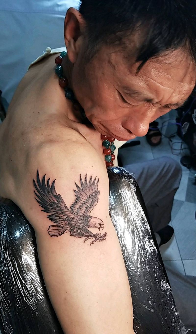 老鹰纹身图片_肩部手臂老传统欧美写实纹身图案