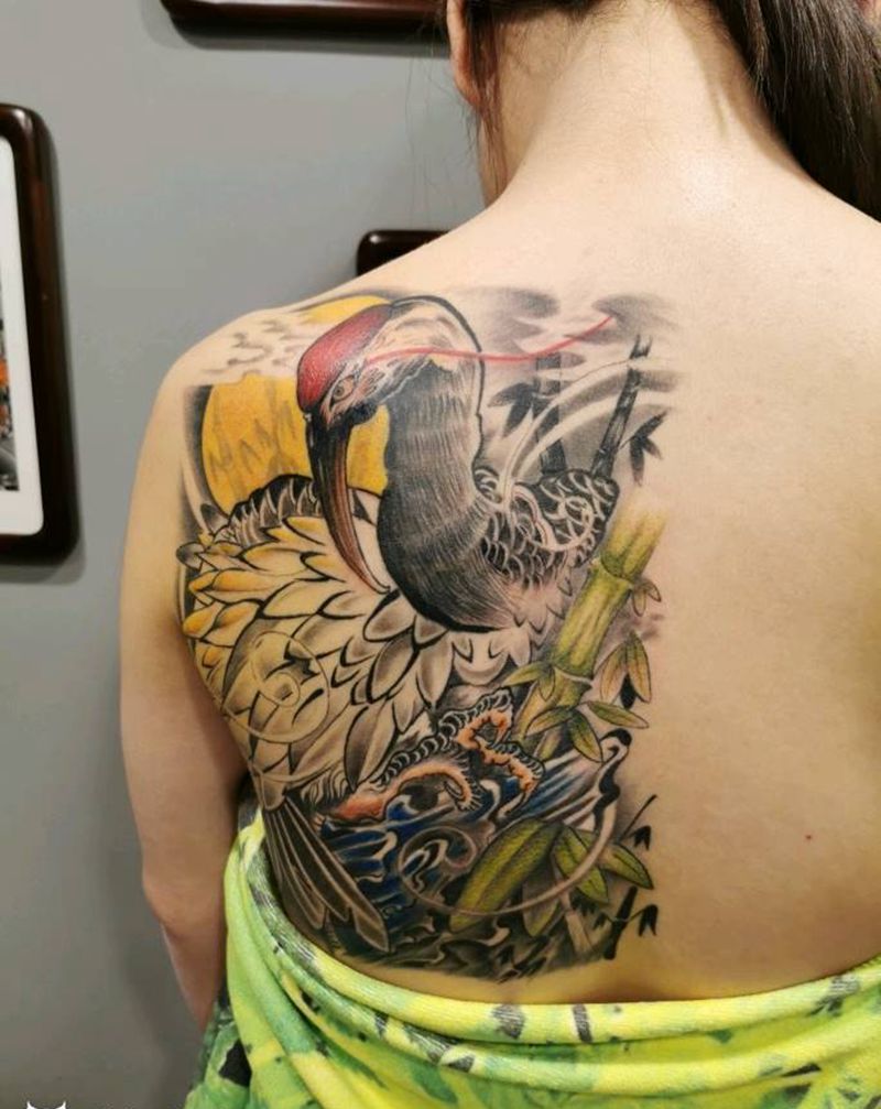 丹顶鹤纹身图片_背部新传统纹身图案