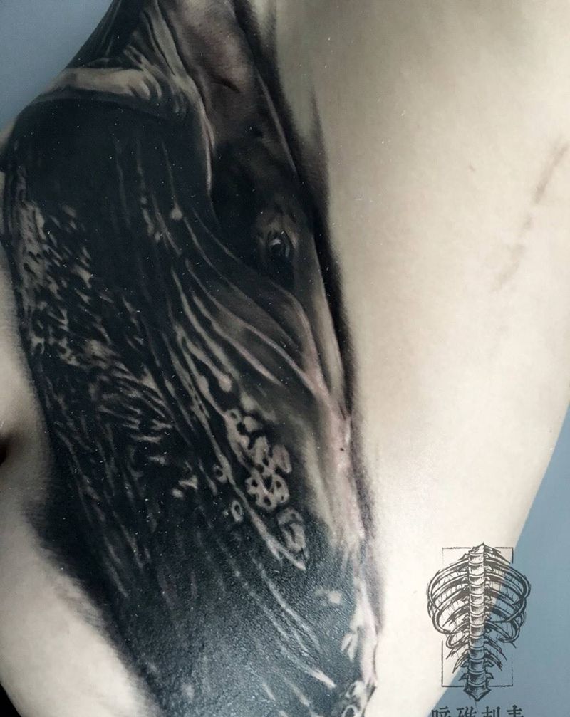 当前位置: 首页 >湖北省武汉市纹身店-暗礁刺青纹身图案>写实鲸鱼纹身图片_原创欧美动物成品背部写实纹身图案