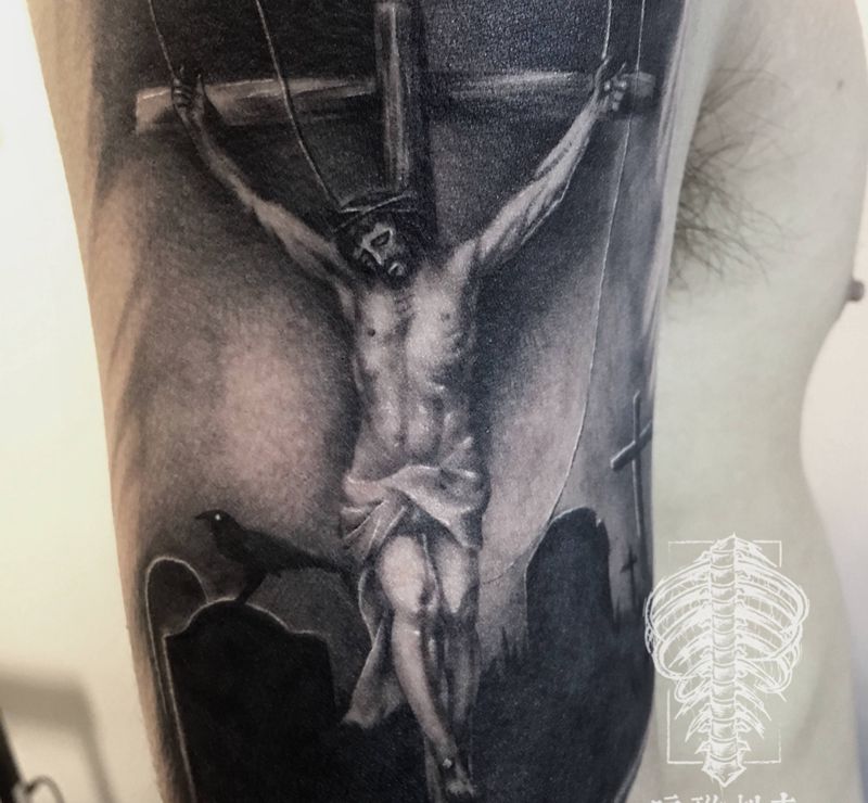 当前位置: 首页 >湖北省武汉市纹身店-暗礁刺青纹身图案>耶稣纹身图片_手臂欧美写实纹身图案