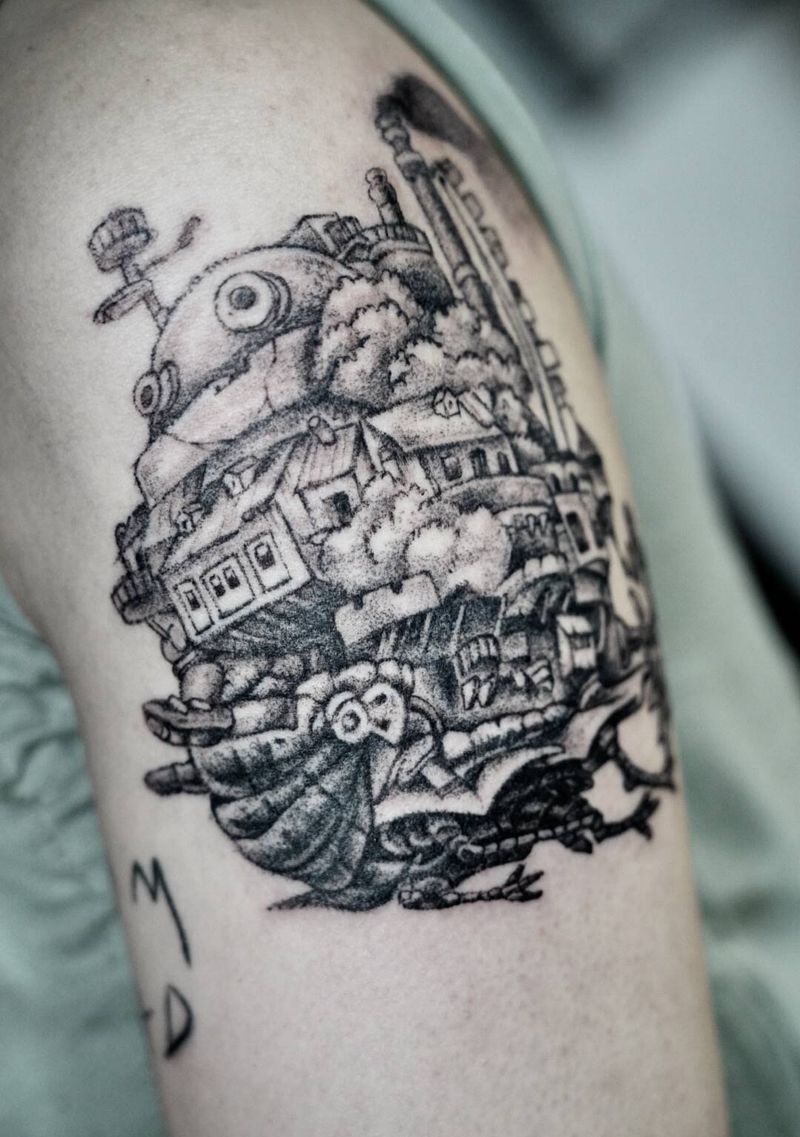 哈尔的移动城堡纹身图片_手臂欧美写实点刺纹身图案