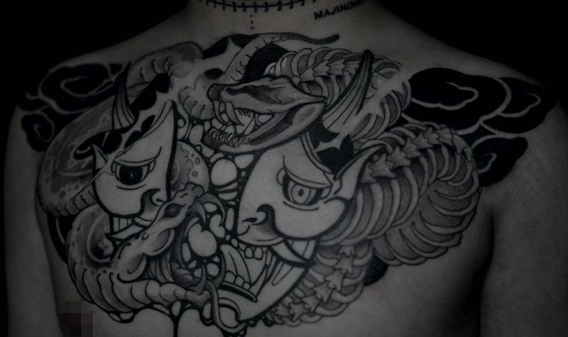 无双大蛇花胸纹身图片_胸部新传统纹身图案
