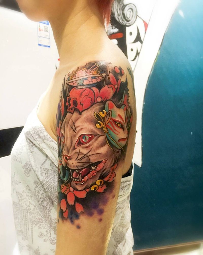 当前位置: 首页 >湖北省荆门市纹身店-纹人墨刻纹身图案>喵星人.猫纹身图片_成品肩部手臂传统动物纹身图案