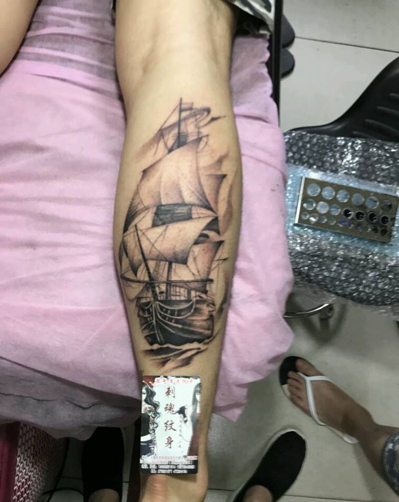 帆船纹身图片_腿部传统写实静物原创花絮生活成品手稿纹身图案