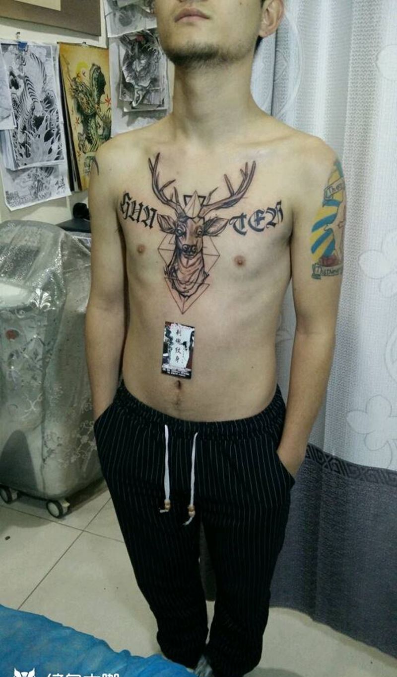 当前位置: 首页 >湖北省十堰市纹身店-刺魂纹身总店纹身图案>麋鹿纹身图片_胸部传统动物成品纹身图案