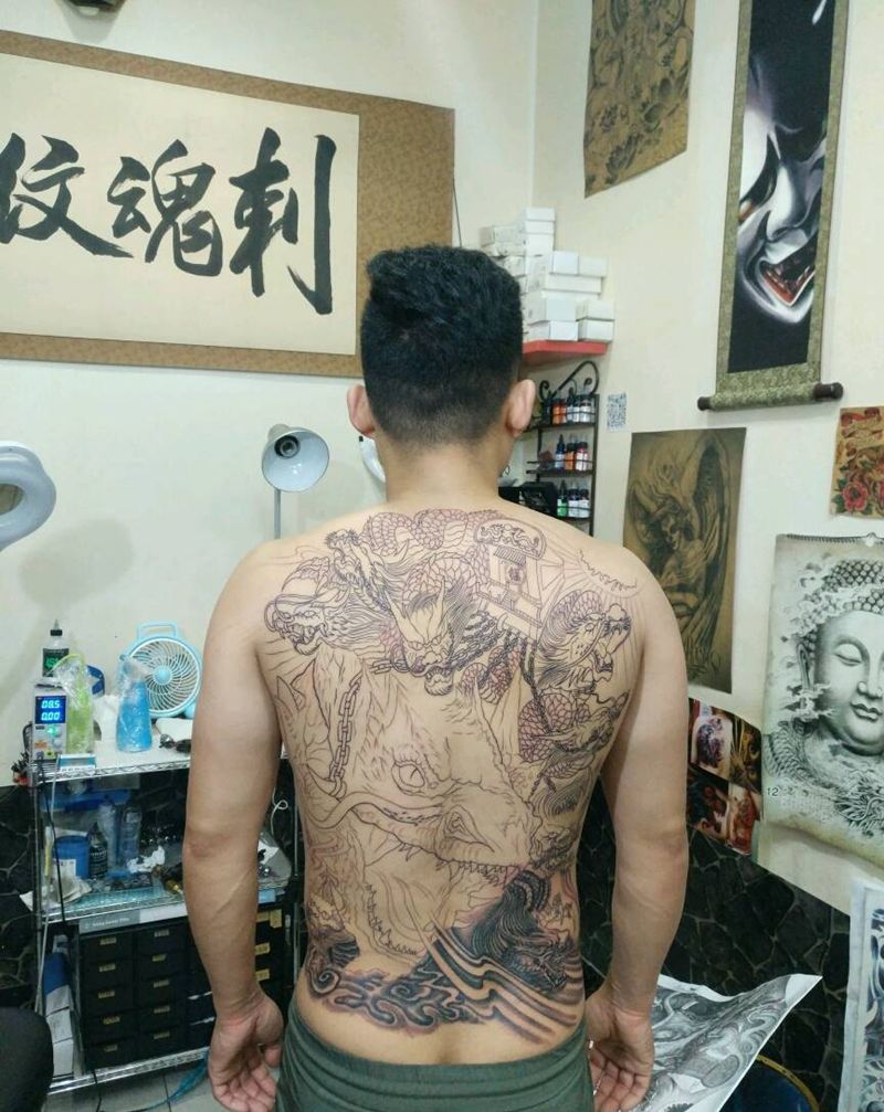 黑灰满背纹身图案