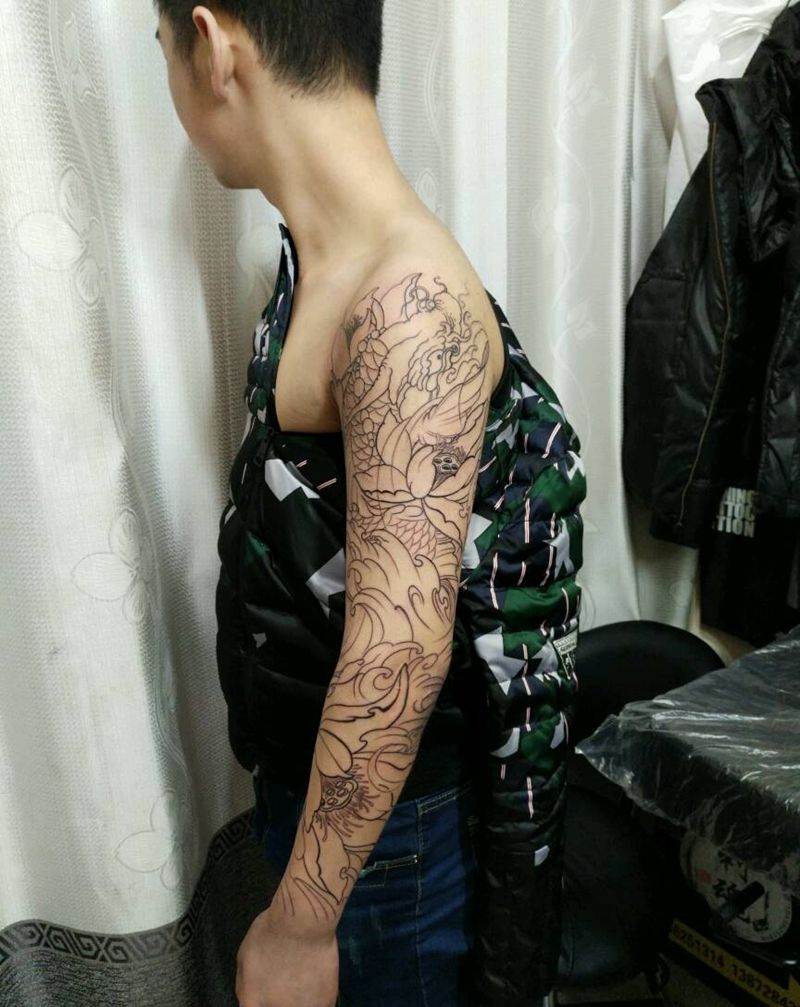 当前位置: 首页 >湖北省十堰市纹身店-刺魂纹身总店纹身图案>大花臂线条纹身图片_手臂传统清新字符原创花絮生活成品插画纹身图案