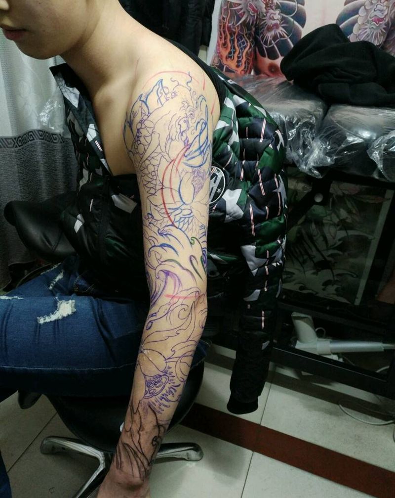 当前位置: 首页 >湖北省十堰市纹身店-刺魂纹身总店纹身图案>大花臂线条纹身图片_手臂传统清新字符原创花絮生活成品插画纹身图案
