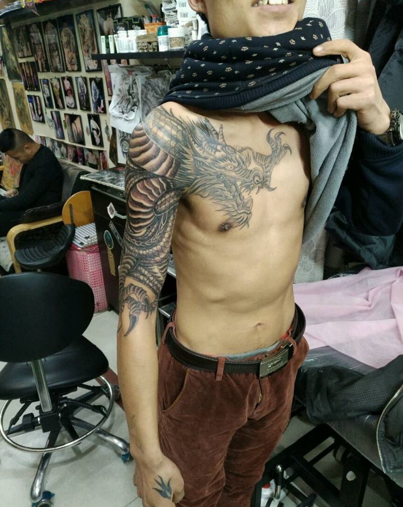 当前位置: 首页 >湖北省十堰市纹身店-刺魂纹身总店纹身图案>过肩龙制作花絮纹身图片_手臂传统动物原创花絮生活成品纹身图案