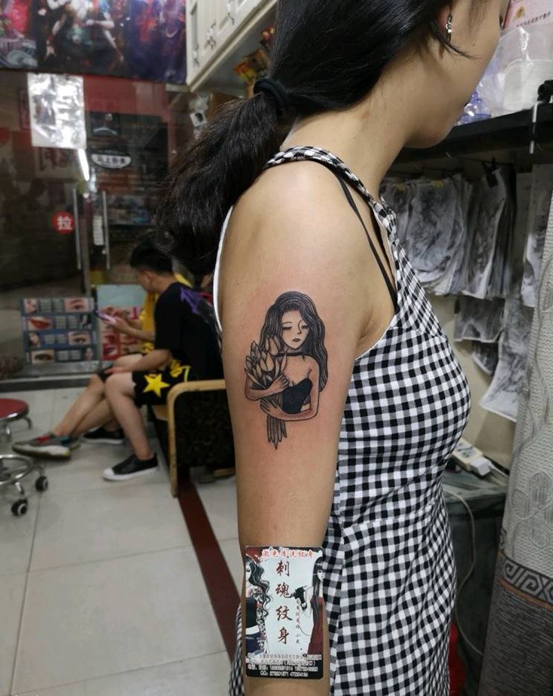 当前位置: 首页 >湖北省十堰市纹身店-刺魂纹身总店纹身图案>小清新美女纹身图片_手臂传统清新人物原创成品手稿插画纹身图案