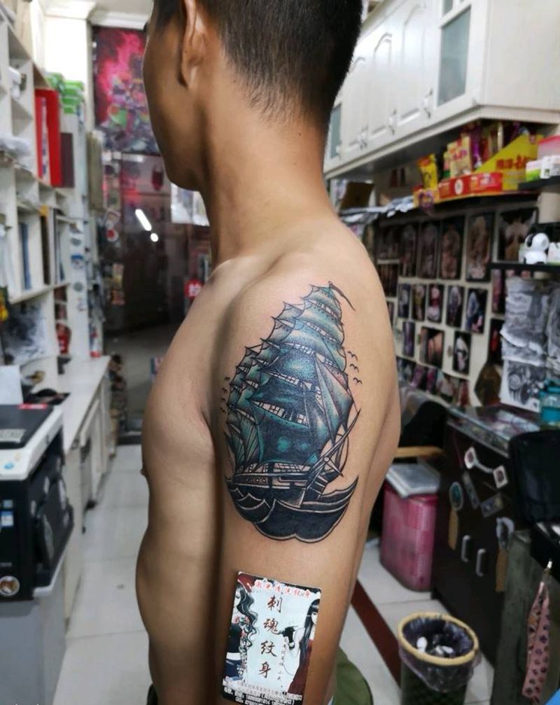 当前位置: 首页 >湖北省十堰市纹身店-刺魂纹身总店纹身图案>船帆 ,遮盖纹身图片_手臂传统原创成品手稿纹身图案