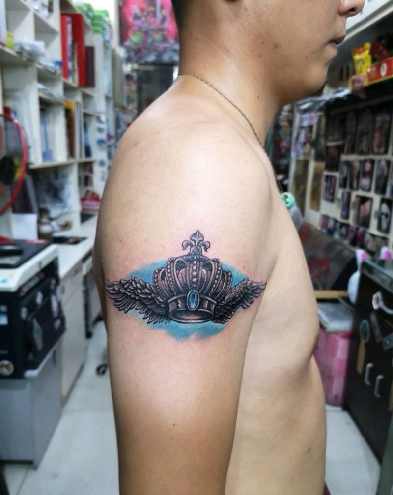 当前位置: 首页 >湖北省十堰市纹身店-刺魂纹身总店纹身图案>皇冠翅膀纹身图片_手臂老传统新传统纹身图案