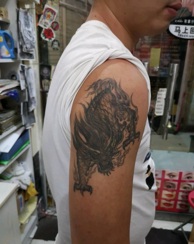 • T网红王老大花腿龙纹身图片_腿部新传统纹身图案