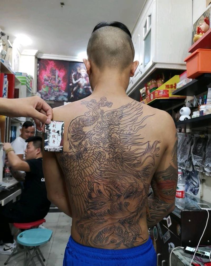 当前位置: 首页 >湖北省十堰市纹身店-刺魂纹身总店纹身图案>满背凤凰线条纹身图片