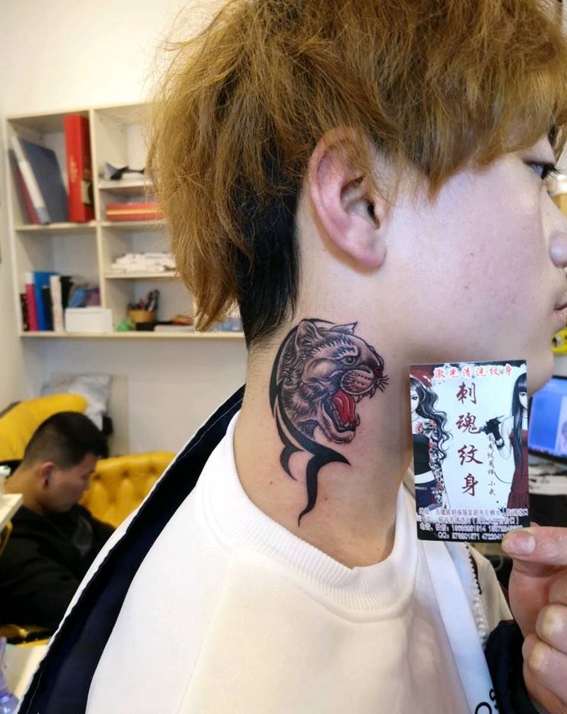 当前位置: 首页 >湖北省十堰市纹身店-刺魂纹身总店纹身图案>豹子头纹身图片_颈部纹身图案