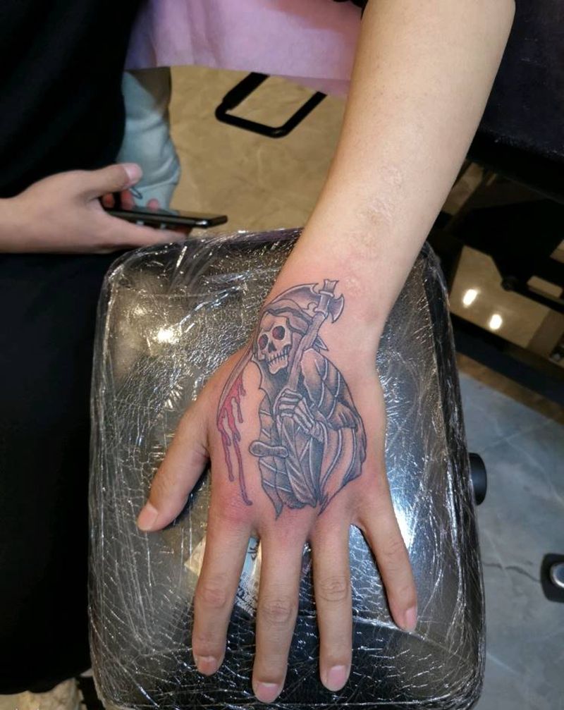 当前位置: 首页 >湖北省十堰市纹身店-刺魂纹身总店纹身图案>死神纹身图片_手部老传统纹身图案