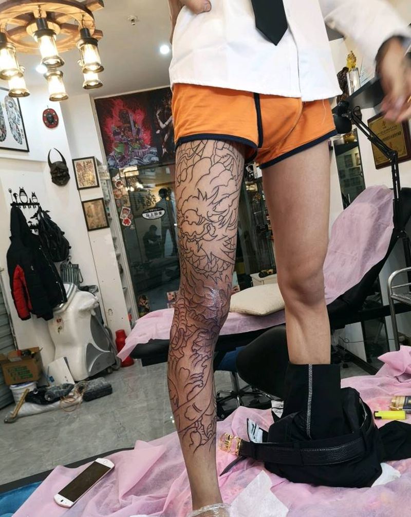 • T网红王老大花腿龙纹身图片_腿部新传统纹身图案