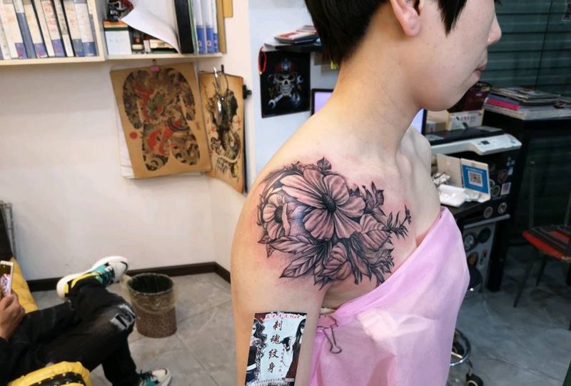 花胸纹身图片_胸部肩部新传统纹身图案