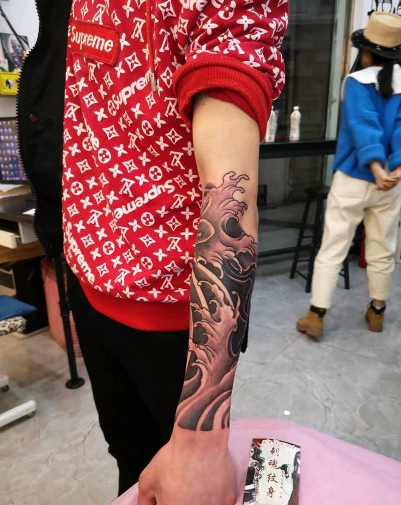 当前位置: 首页 >湖北省十堰市纹身店-刺魂纹身总店纹身图案>海浪小花臂纹身图片_手臂新传统图腾纹身图案