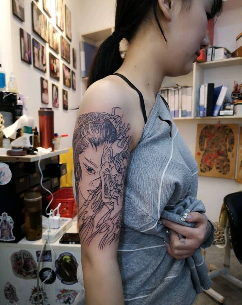 艺伎 虞姬纹身图片_腿部新传统纹身图案