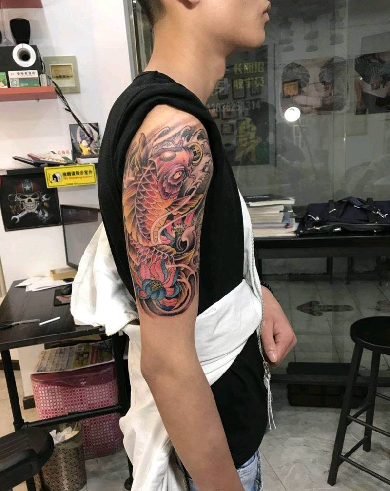 色彩锦鲤纹身图片_手臂新传统纹身图案