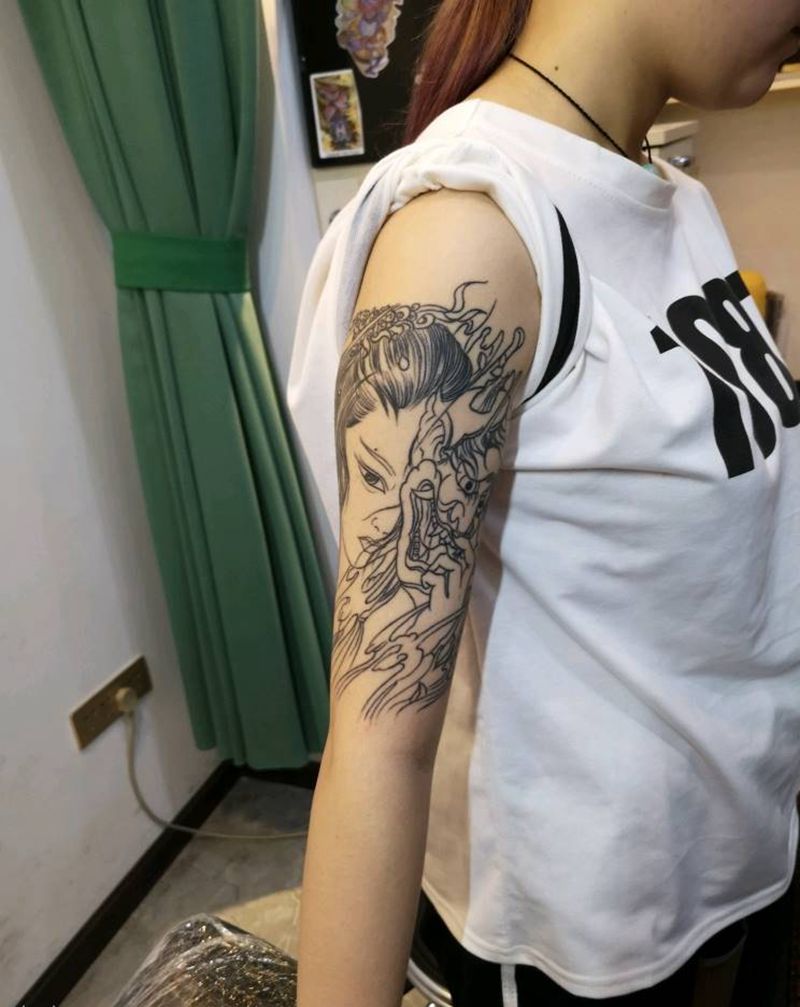 当前位置: 首页 >湖北省十堰市纹身店-刺魂纹身总店纹身图案>艺伎纹身图片_手臂新传统纹身图案