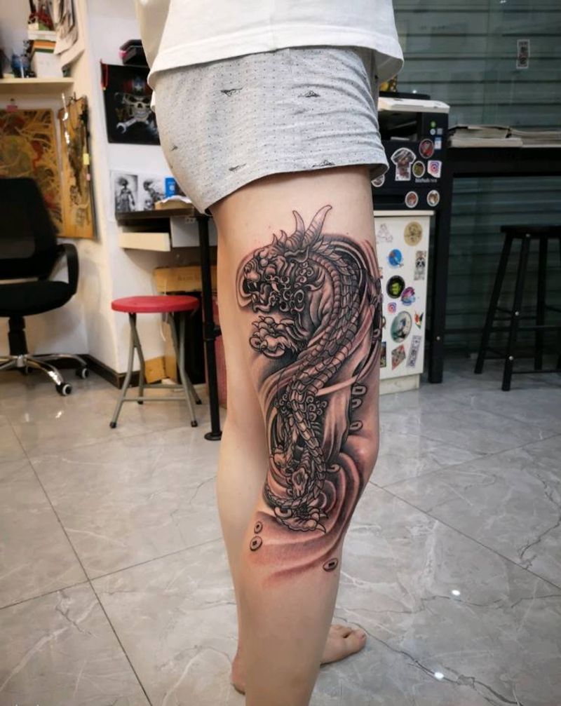 • T网红王老大花腿龙纹身图片_腿部新传统纹身图案