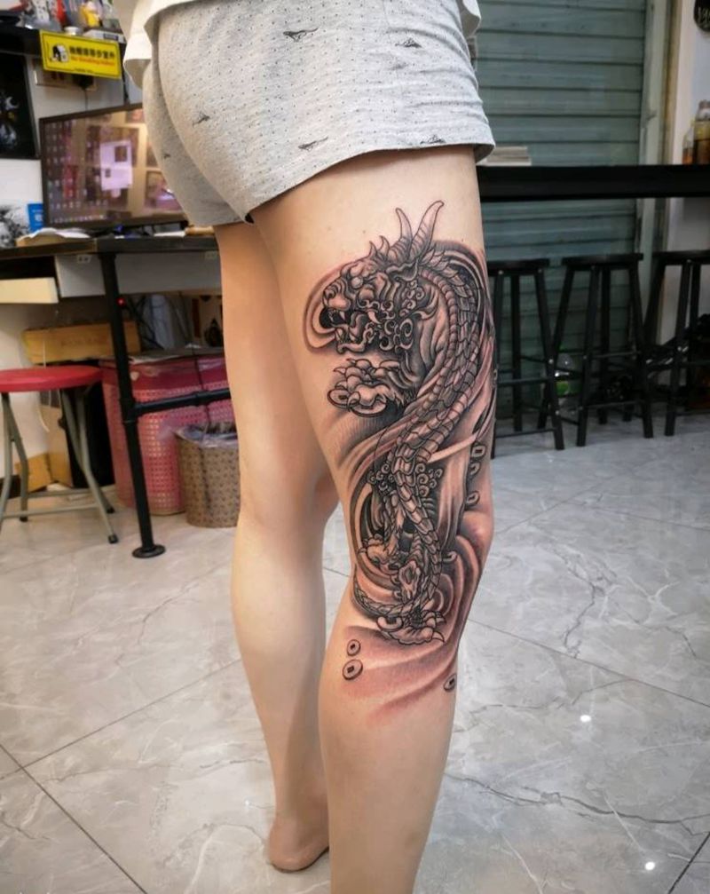• T网红王老大花腿龙纹身图片_腿部新传统纹身图案