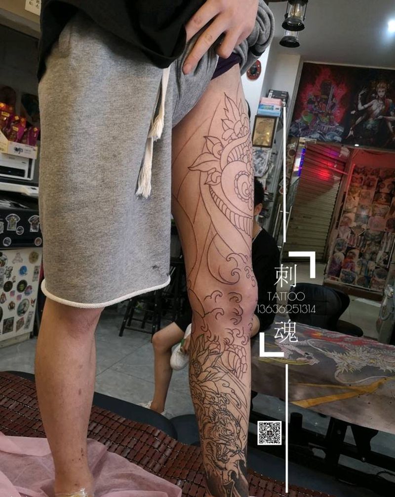 • T网红王老大花腿龙纹身图片_腿部新传统纹身图案