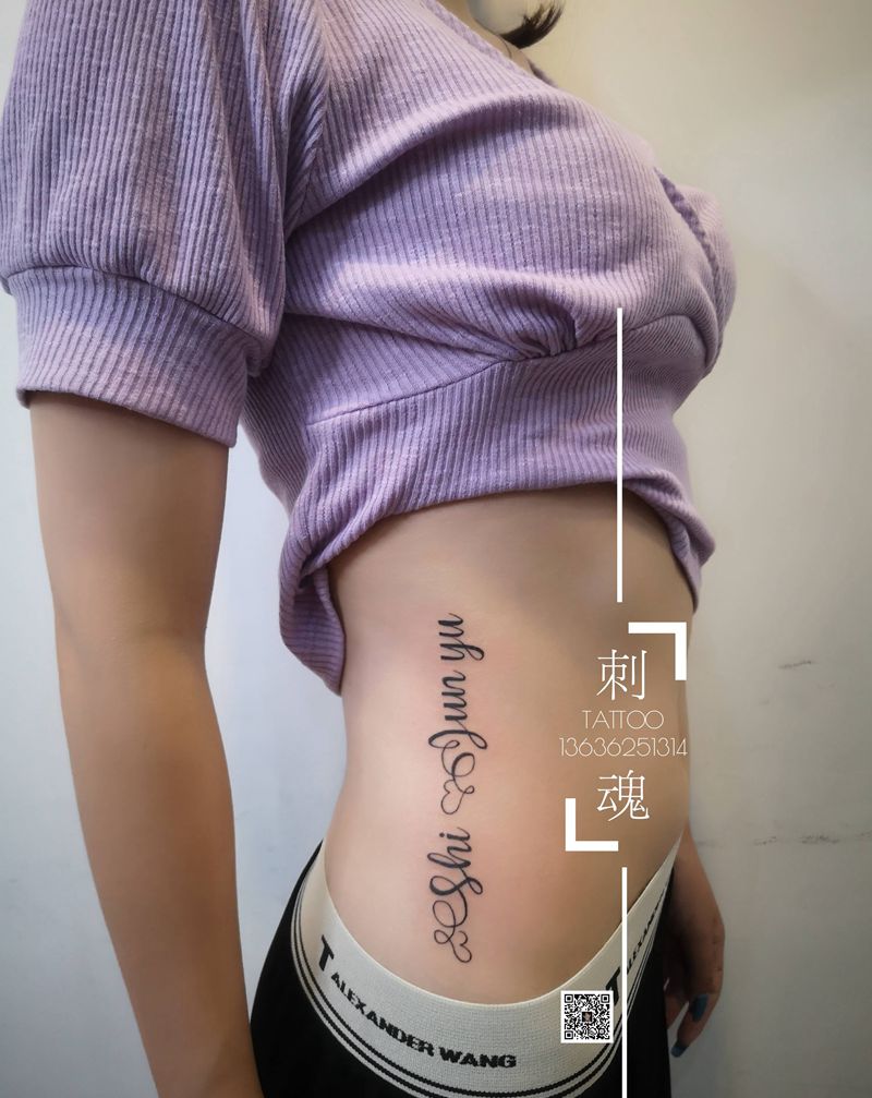 侧腰小字母纹身图片_腰部几何花体字纹身图案