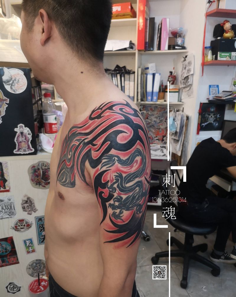 当前位置: 首页 >湖北省十堰市纹身店-刺魂纹身总店纹身图案>半甲图腾修改上色纹身图片_肩部新传统图腾纹身图案