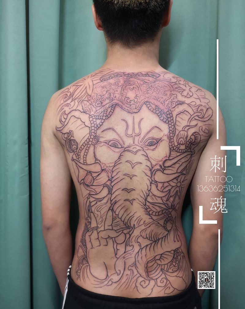 当前位置: 首页 >湖北省十堰市纹身店-刺魂纹身总店纹身图案>满背象神线条纹身图片_背部新传统纹身图案