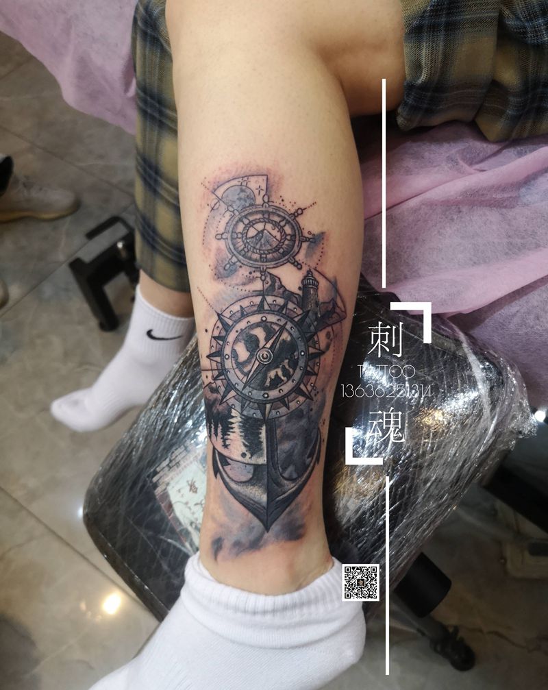 船锚,遮盖纹身图片_腿部水彩几何纹身图案