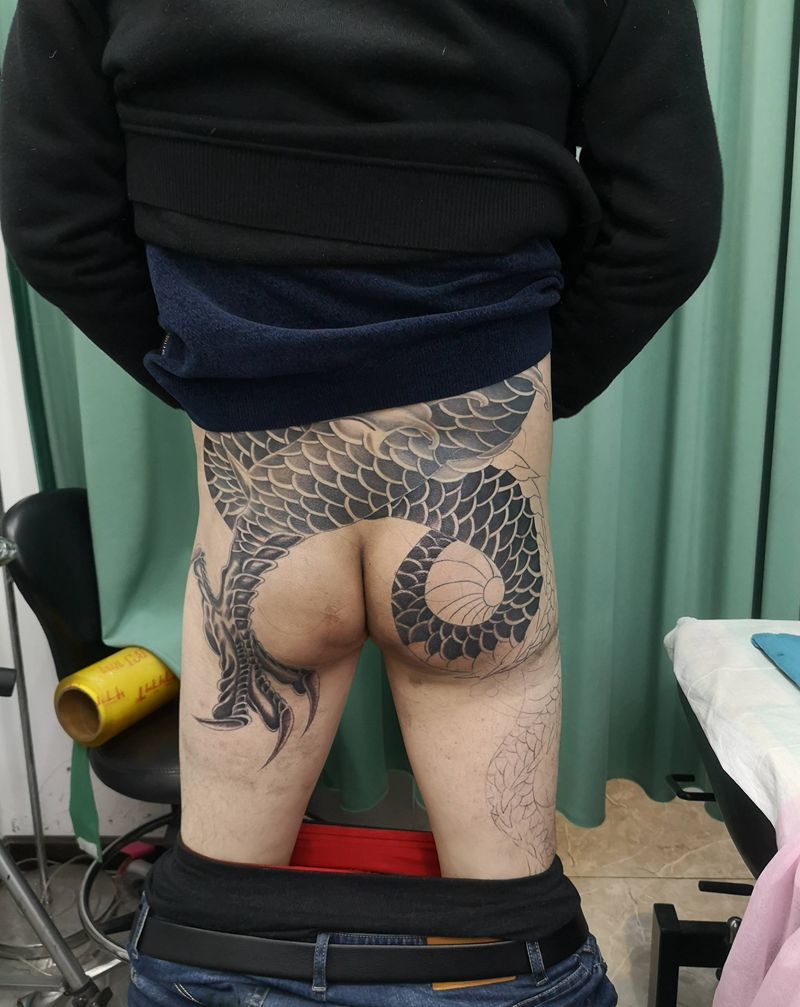 • T网红王老大花腿龙纹身图片_腿部新传统纹身图案